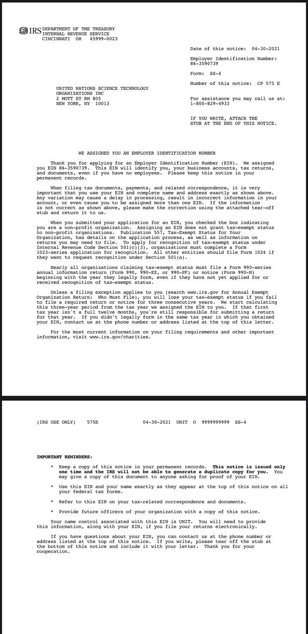 Registration certificate of the United Nations Sciences and Technology Organization